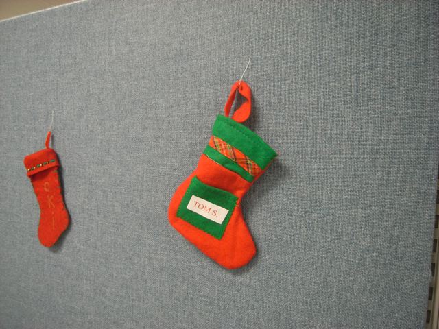職場に、全員分の小さな靴下がぶら下がりました。僕のはちょっと大きめ。何を入れてもらえるかな?