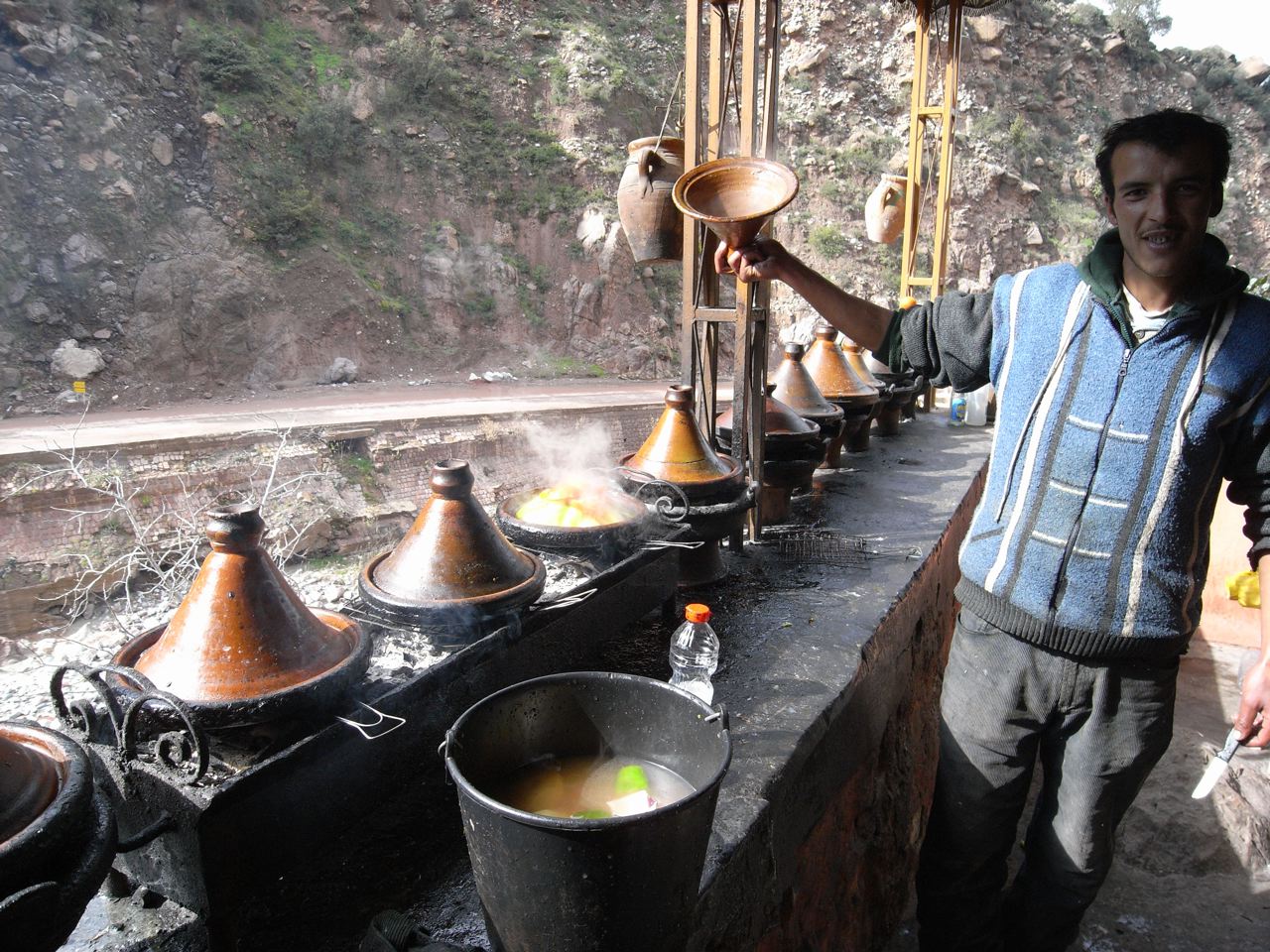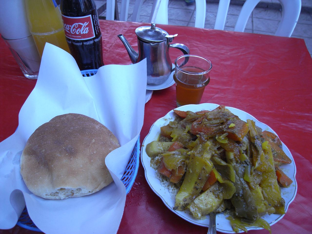 ここの目玉はタジンという煮込み。こんなふうに蓋をぱかーんと開いて、湯気を見せるのが客寄せのパフォーマンスみたい。