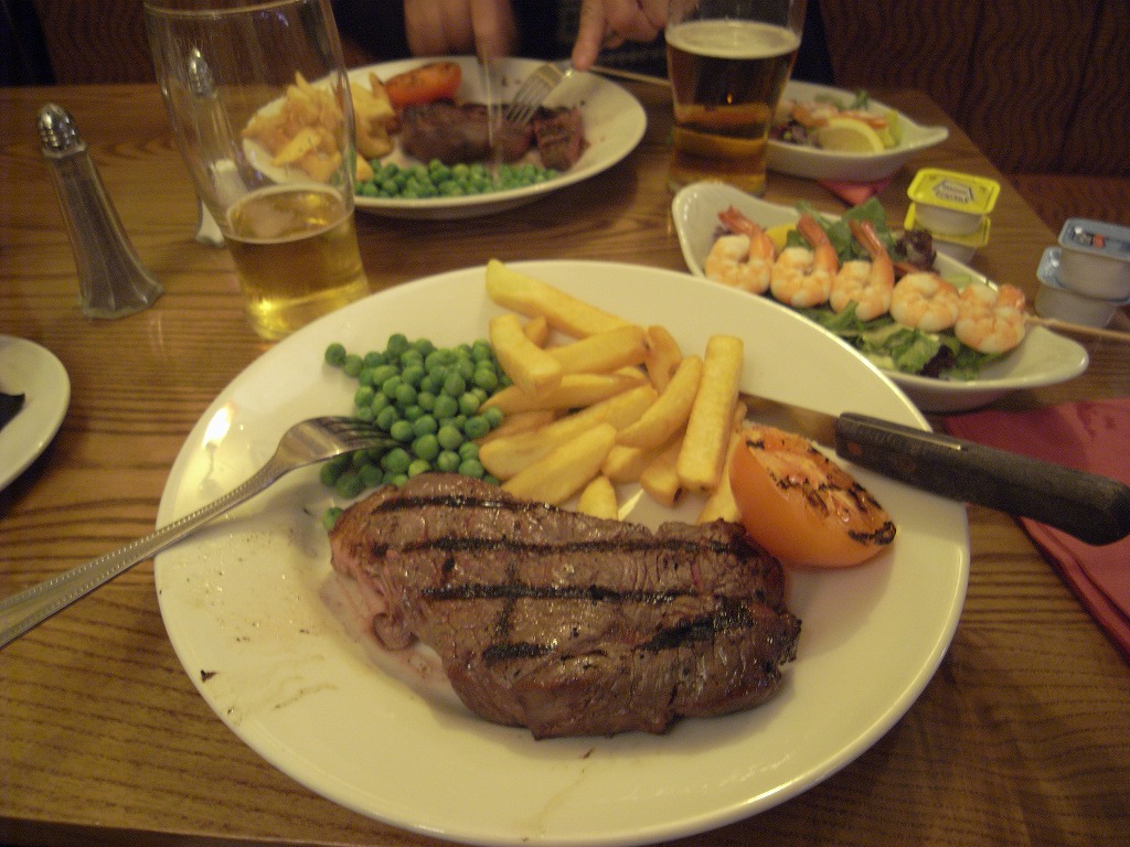 19:10 夕食はステーキ。イギリスは頼んだ焼き加減を無視して必ずウェルダンになると聞いていたんですが、ここではばっちりのミディアムレアが出てきました。