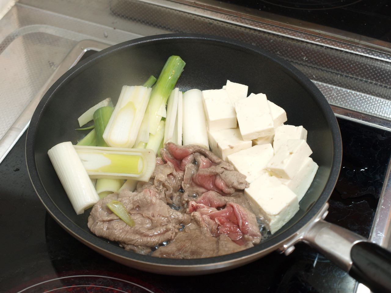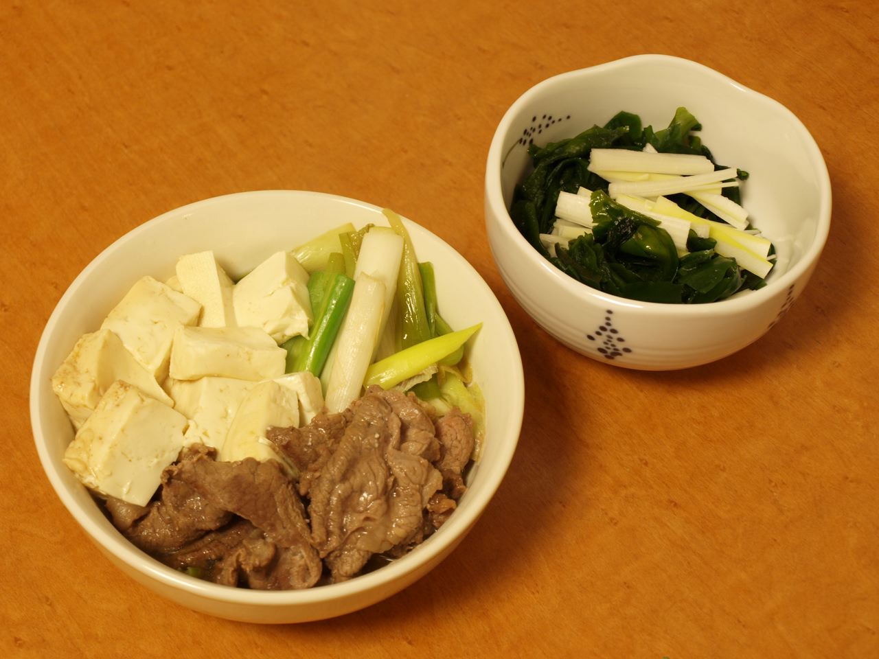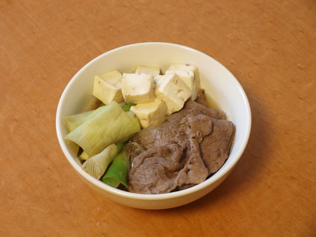 長ネギは、ビジュアル的にも斜めに切った方が、バラバラになりずらいですよ。豆腐も焼き豆腐の方が、煮崩れなくて綺麗に仕上がります。しらたき、しいたけ、春菊なんかも入ると・・・。こだわると、きりがないです。