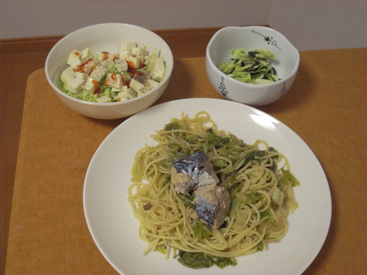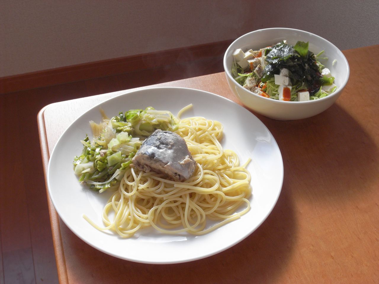 12:14 さばスパゲティ。麺を3食分茹でたので、明日の朝までスパ続き。