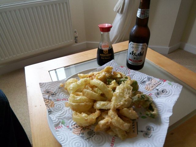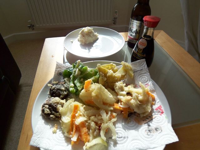 さて、日本はお盆ですね。こちらのお方がお召し上がりのお刺身と日本酒がとてもおいしそう…。というわけで、僕もお盆気分を味わうことに。お刺身と日本酒は手に入らないので、天ぷらとスーパードライを組み合わせてみることにしました。