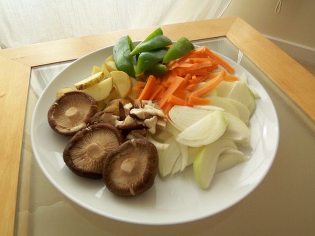 しいたけ、ピーマン、じゃがいも、あとかき揚げ用に玉ねぎとにんじん。