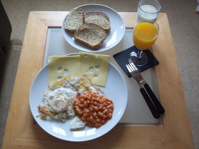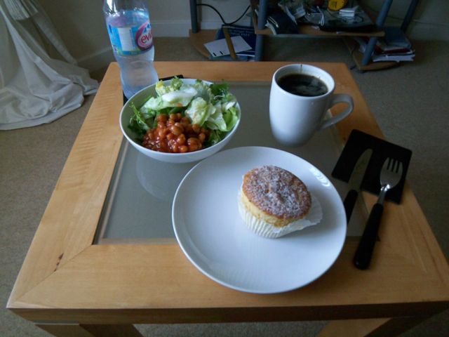 7:10 金曜日は会社でブレックファーストを食べる習慣なので、軽めの朝食。昨夜のケーキとベイクドビーンズという、有り得ない組み合わせ。