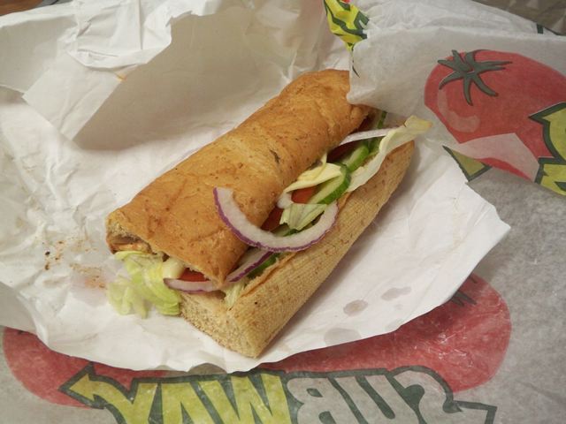 12:32 寝坊してお昼ごはんの用意ができなかったので、モールまで歩いて初めてのサブウェイ。いろんなチョイスは上手に注文できないから、テレビで盛んに宣伝してる「レゲレゲチキン」をオーダー。それでも、やれきゅうりはどうの、たまねぎはどうする、トマトはいくつ入れるだのいろいろ聞かれて大変。3.5ポンド。