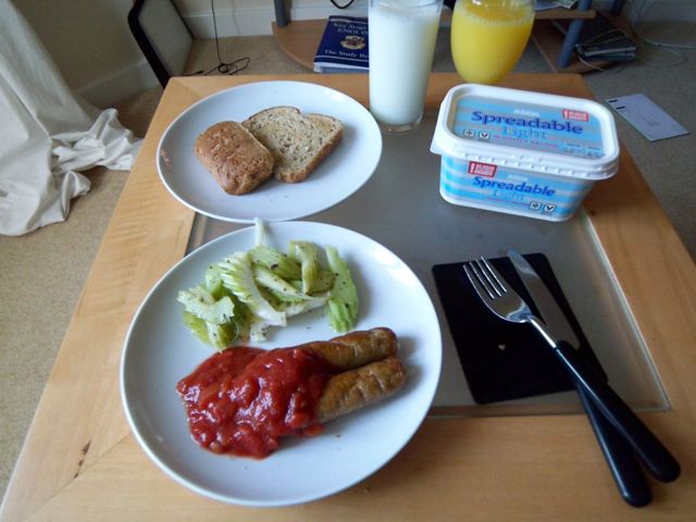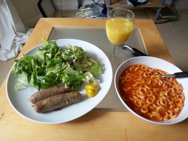 7:05 昨日買った二袋で1.5ポンドのソーセージ。オーブンで火を通しすぎたのがいけなかったのか、あまりおいしくありませんでした。