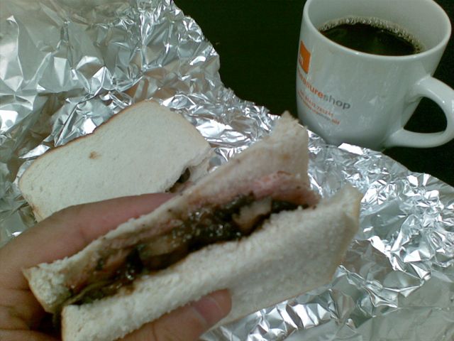12:50 会社に戻ってお昼ごはん。ベーコンとマッシュルームのサンドイッチ、1.8ポンド。