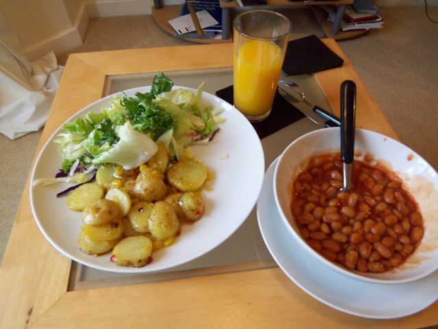 19;45 夕食は会社の方に誘っていただいて、ダッドリーのホテルへ。タイカレーを注文するもライスがないらしく、代わりにチップス(ポテトフライ)でいいかと聞かれたけど、ポテトで食べるカレーが想像できなかったので、やむなくメニューを変更しました。