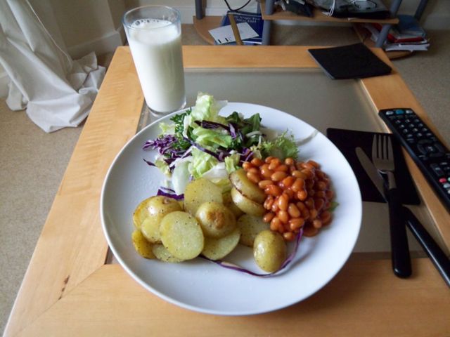 17:38 今日はお昼ごはんにありつけず、急いで夕ごはんの支度をしました。変わり種のベイクドビーンズ、今日のはメキシコ風な感じです。