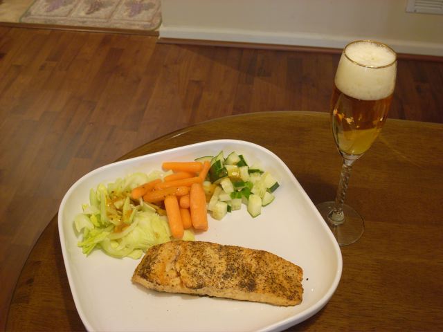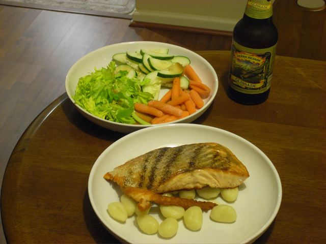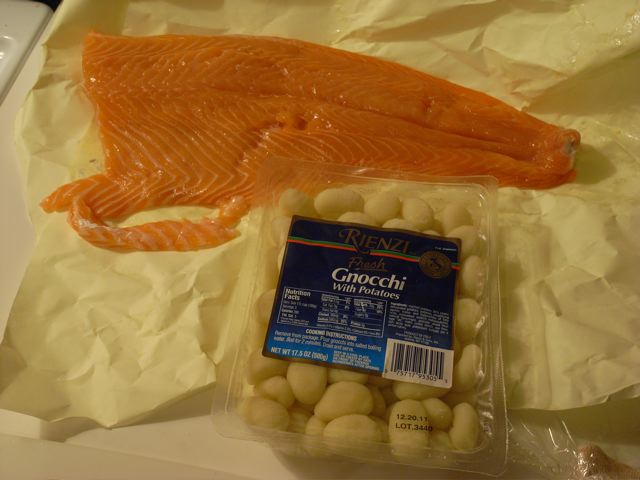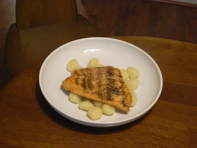 夜はステーキにするつもりでスーパーに行ったのだけど、魚屋のオヤジさんにサーモンとニョッキをすすめられ、買ってみた。