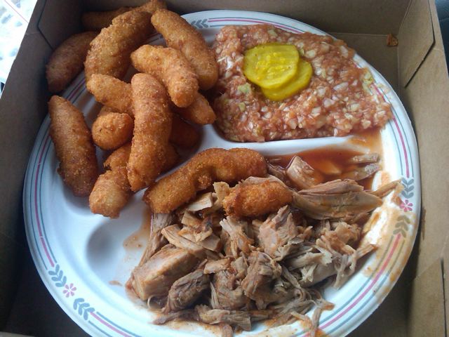 生ひき肉みたいに見えるのは、赤いコールスロー、その名もレッドスロー。ポークかチキンを裂いたバーベキューにこのレッドスローを添えるのがノースカロライナ流らしい。サイドは揚げパン。