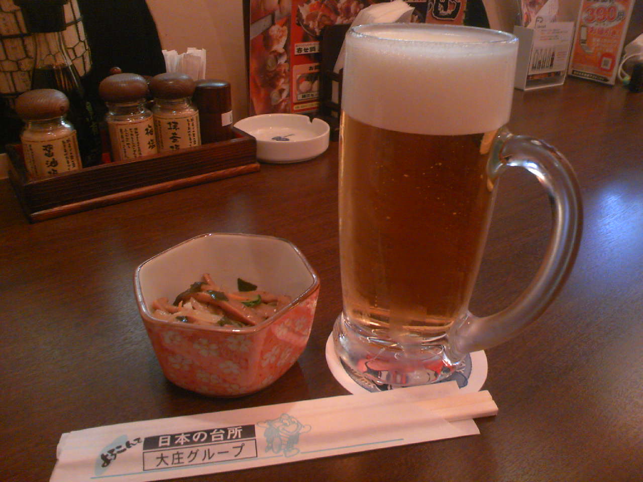 20:34 がっくり落ち込んで駅へ戻り、電車の待ち時間に気分転換、庄屋でプレモル。