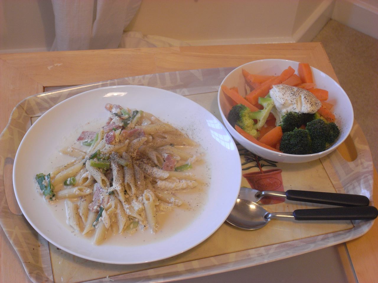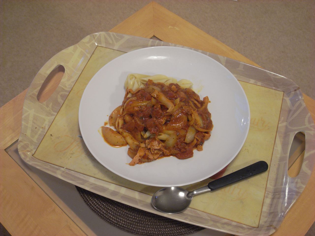 18:09 うっかり、ドボンと既製品のトマトソース一瓶まるごとフライパンに投入してしまったので、明日の朝も同じメニューになる予定。
