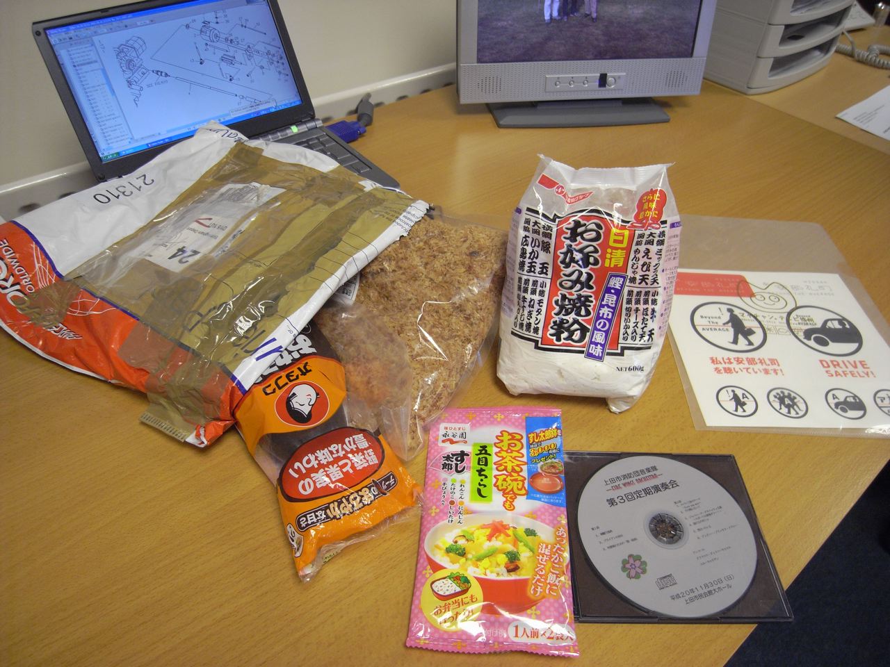日本を発ったときはおしゃれな紙袋に入ってたみたいだけど、届いたときは上記の状態。差出人も受取人も判らない、使い古しの宅配袋に入った会社宛の怪しい荷物。抜き打ちかX線、または申告内容が怪しかったのかどうか判らないけど、開封検査に当たっちゃったらしいです。確かに麻薬と海賊版DVD、どっちも重点対象品ではあるよなぁ。やましいところはないので、何も問題なかったはずだけど、なぜか宛先不明で連絡待ちになってたみたい。つまりは、元の梱包と伝票をなくしちまったものと推察。ひどい話だよねぇ。