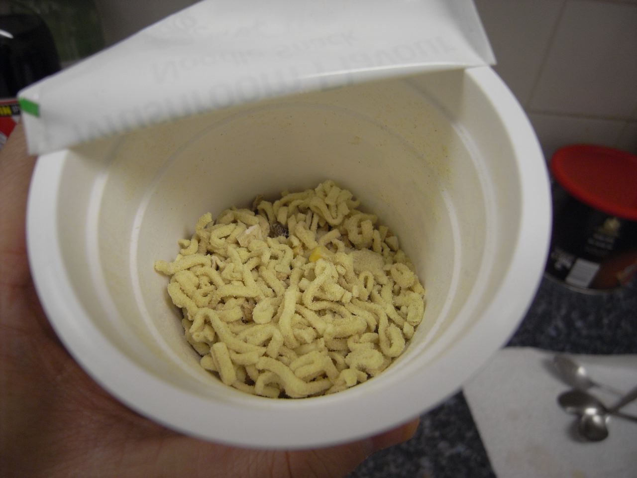 ベビースターよりも麺が短い。味付けもかなり控えめ。ジャンクフード仲間のジョンはソイソースと激辛チリソースを投入してました。それなりに腹持ちはするので、究極の貧乏飯にはいいかもしれない。