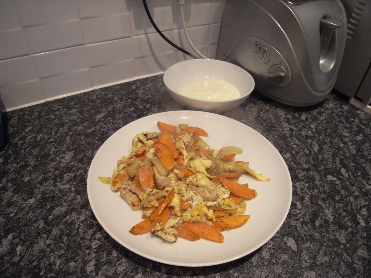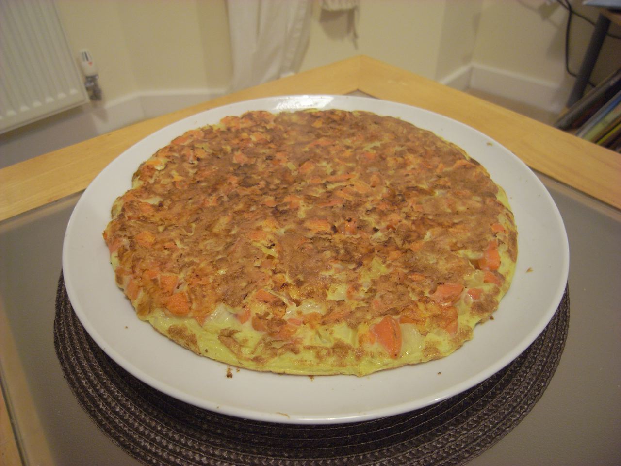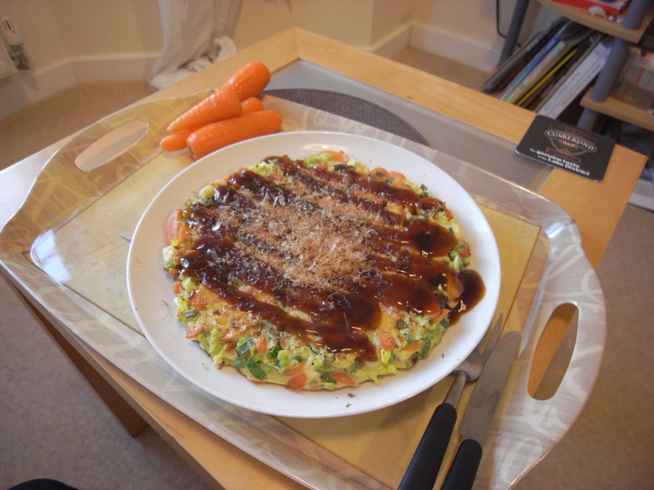 明日の朝食。調子に乗って、人参と玉ねぎだけで作ってみた。もはやお好み焼きではなく、でかいかき揚げ、またはオムレツのようなものだ。ちょっとだけ味見してみたけど、悪くない。すごいな、日清お好み焼き粉。